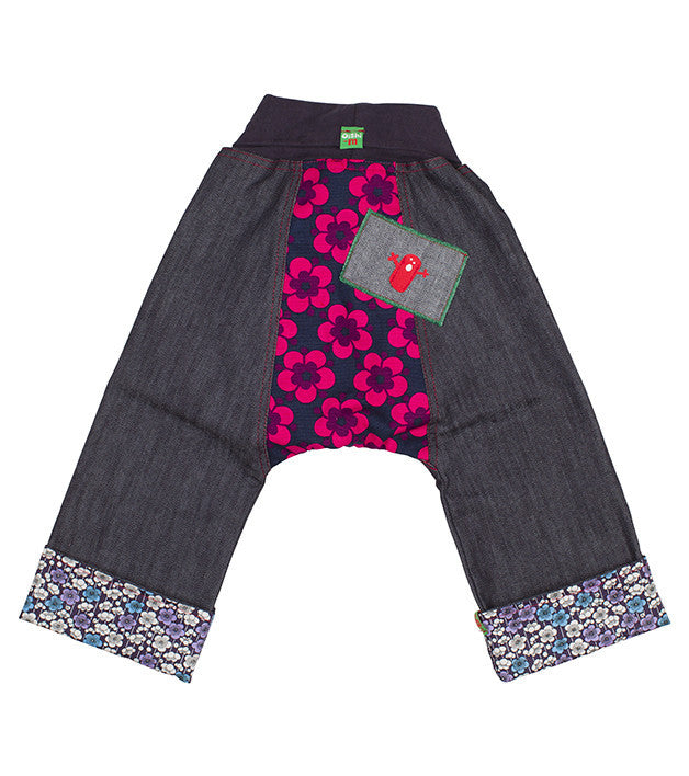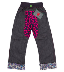 Ink denim 65% cotton, 32% poly, 3% elastane with 100% cotton pink floral bottom panel.